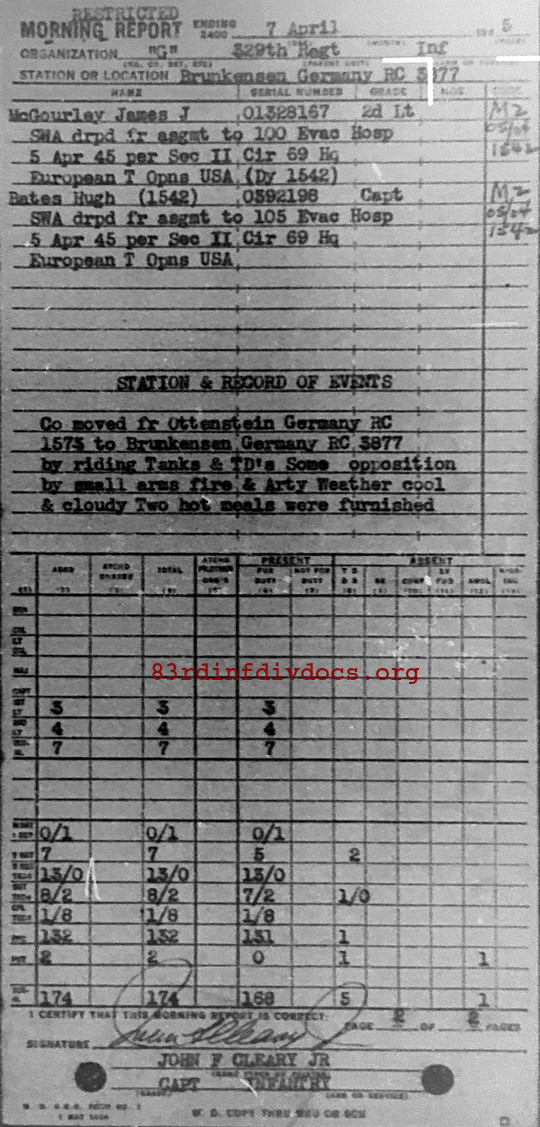 Co moved fr Ottenstein Germany RC1573 to Brunkensen, Germany RC3877 by riding Tanks and TD's. Some opposition by small arms fire and Arty. Weather cool and cloudy. Two hot meals were furnished,