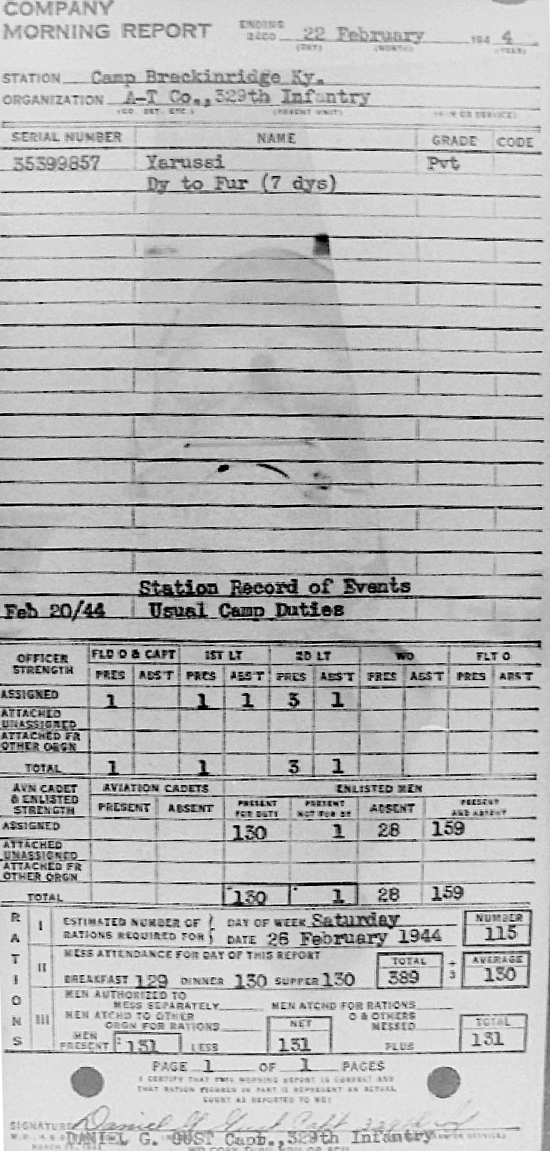 Morning report ATCO/329 for February 22, 1944