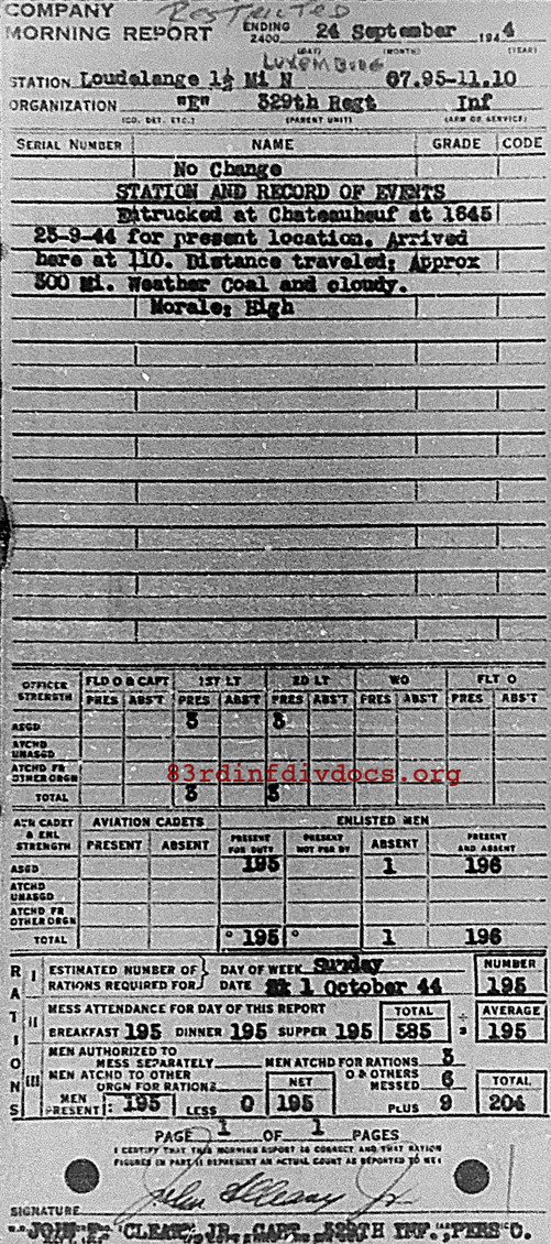 Entrucked at Chateauneuf at 1645 23-90-44 for present location. Arrived here at 110. Distance traveled: Approx 300 Mi. Weather coal and cloudy. Morale: High