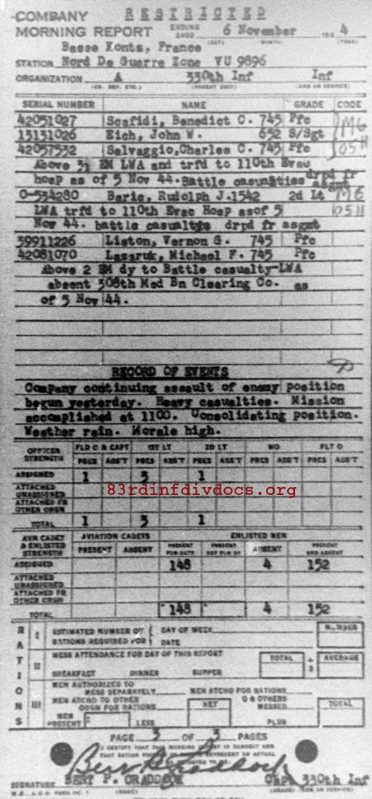 Company continuing assault of enemy position begun yesterday. Heavy casualties. Mission accomplished at 1100. Consolidating position. Weather rain. Morale high.