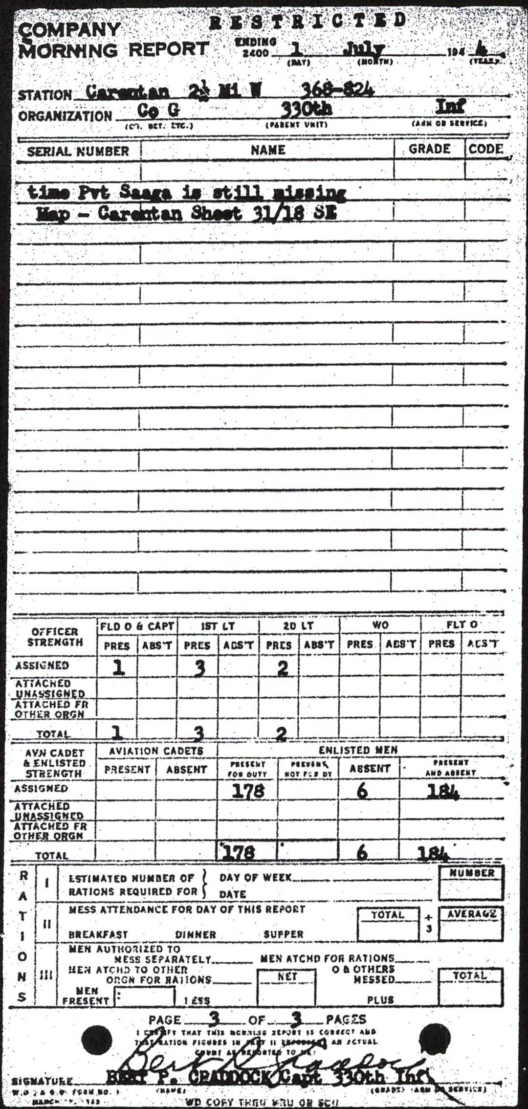 Morning report G/330 for July 1, 1944