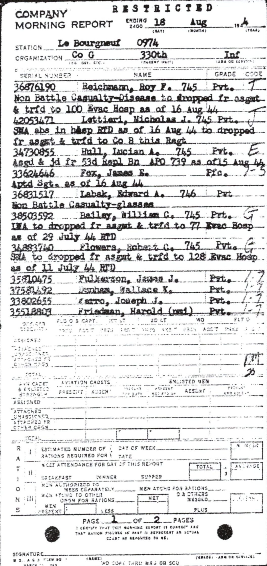 18 Aug 44 - Military training and combat instructions. Co stood review for presentation of awards