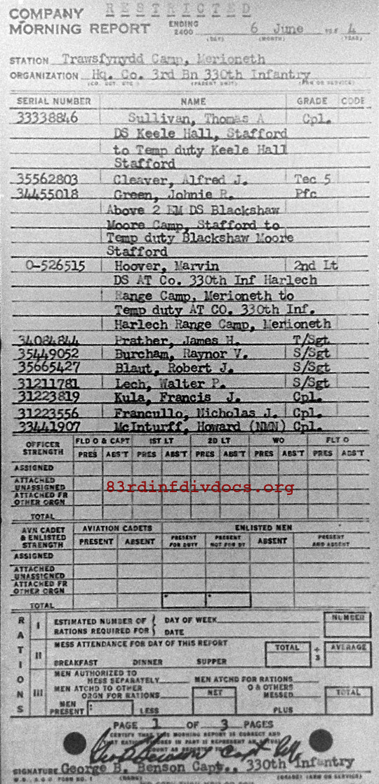 Morning report HQCO3BN/330 for June 6, 1944