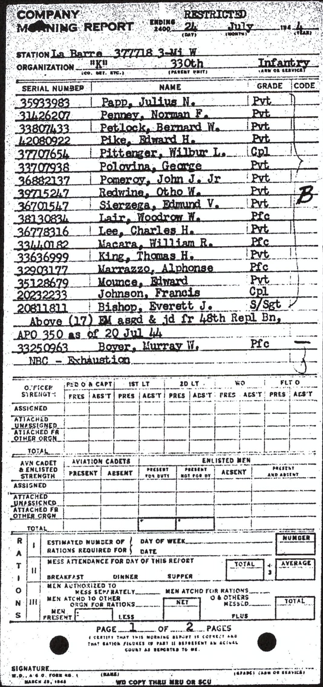 Morning report K/330 for July 24, 1944