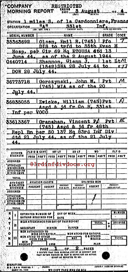 Morning report A/331 for August 3, 1944