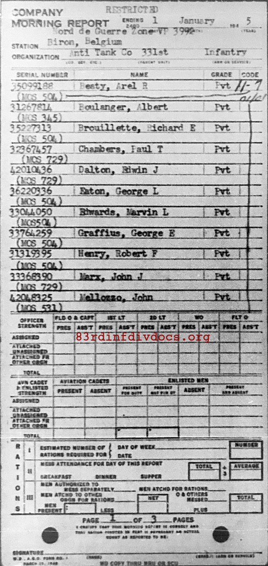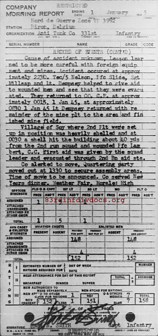 Cause of accident unknown. Lesson learned to be more careful with foreign equipment and mines. Accident occured at approximately 2230. Tec/5 Nelson, Pfc Slice, Sgt Millsap and Lt. Dempsey helped to give aid to wounded men and see that they were evacuated. They returned to CO C.P. at approximately 0015, 1 Jan 45. at approximately 0830 1 Jan 45 Lt Dempsey returned with the remainder of the mine plt to the area and finished mine field.