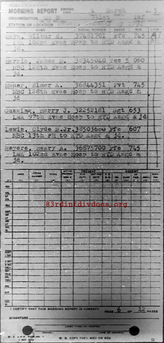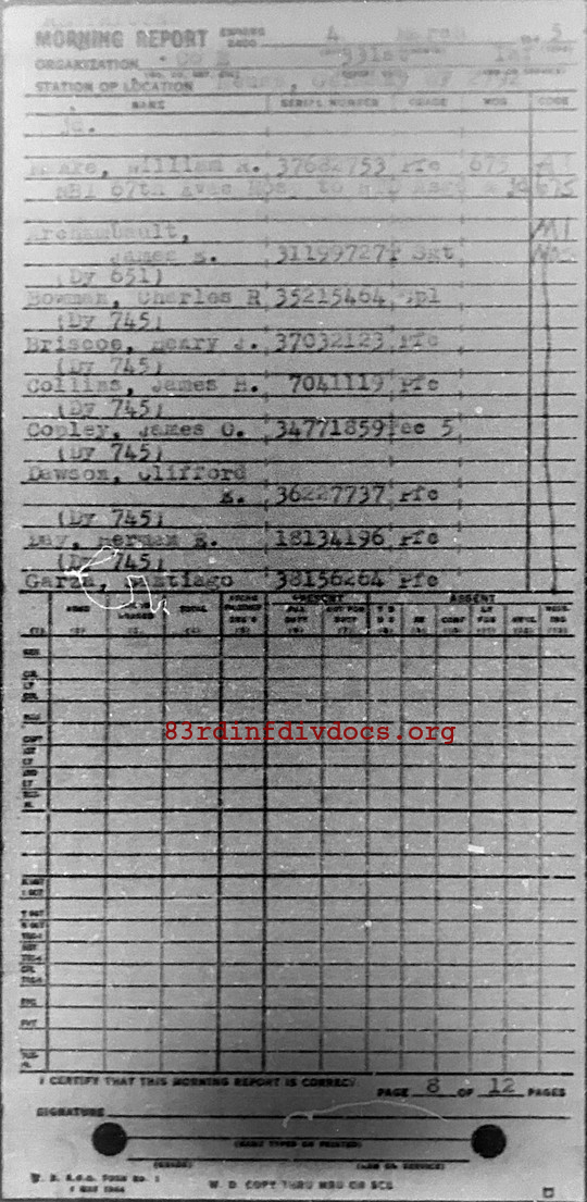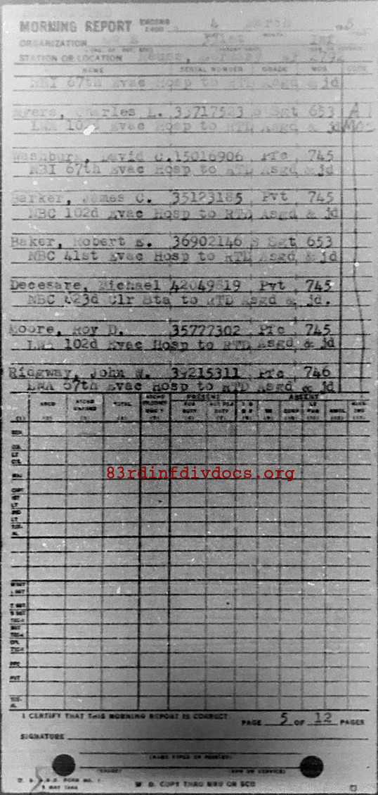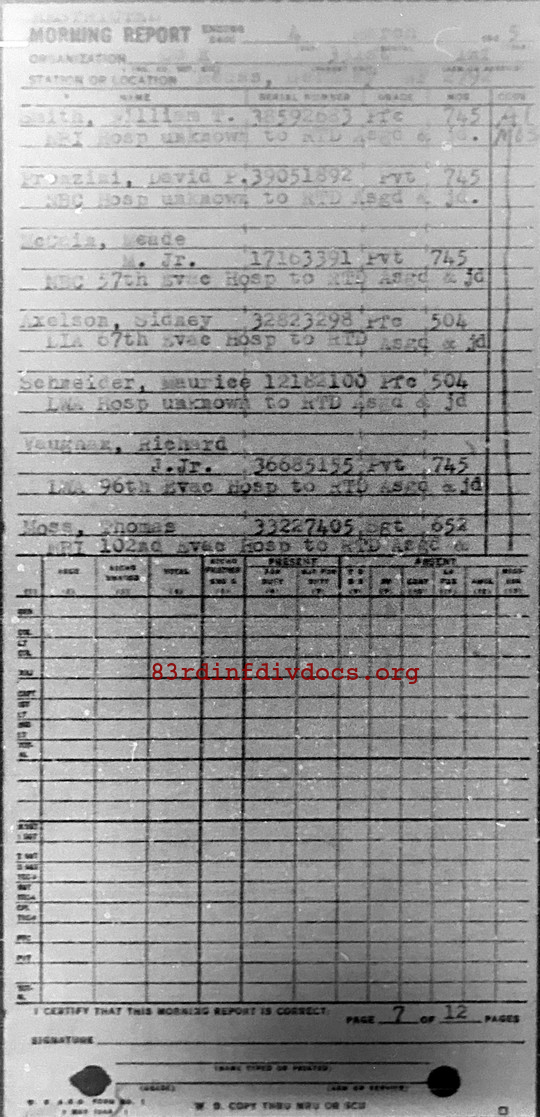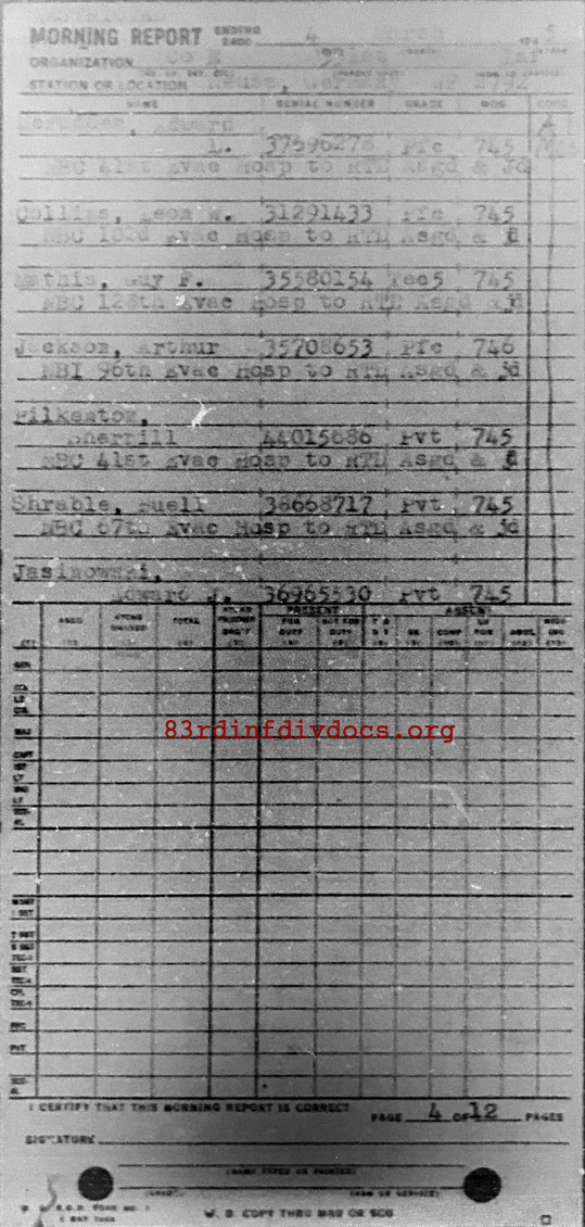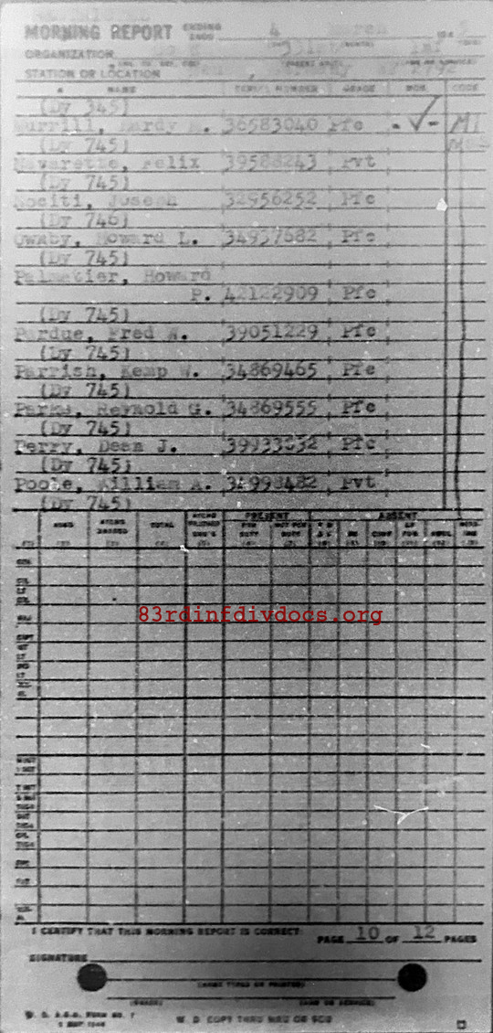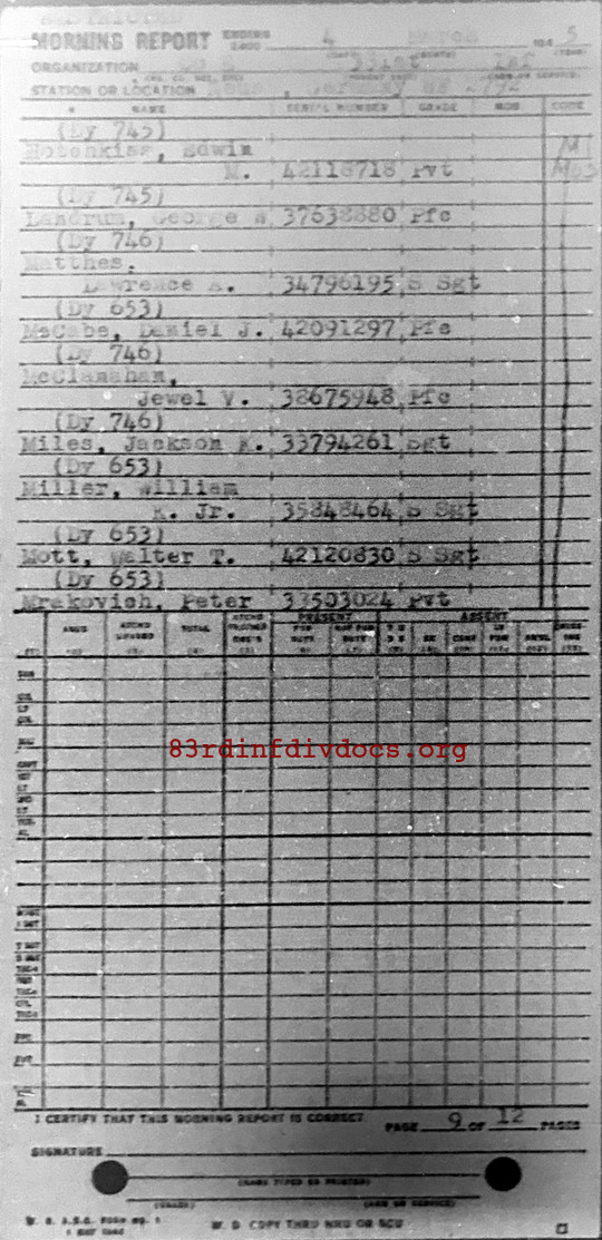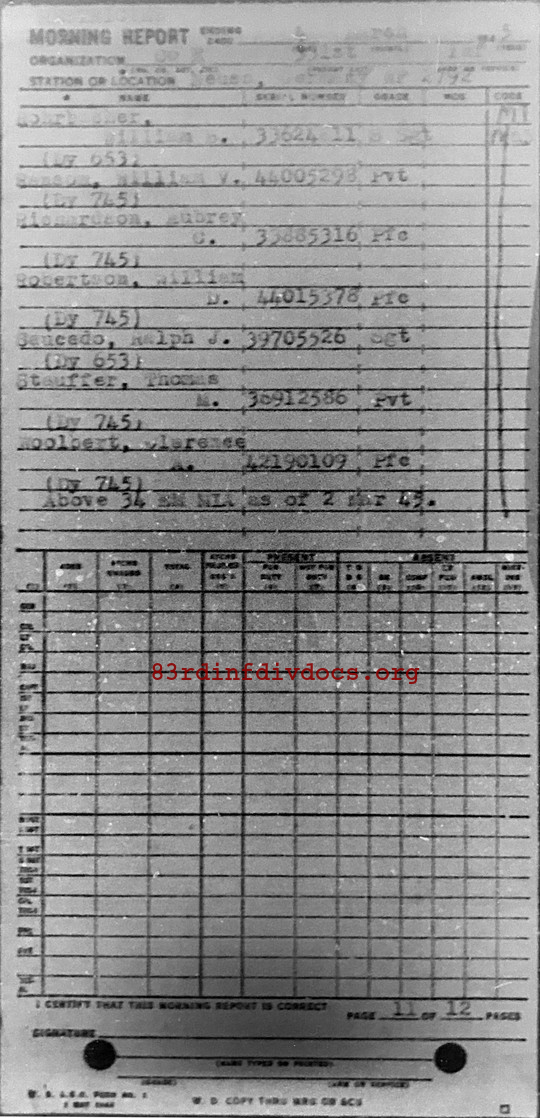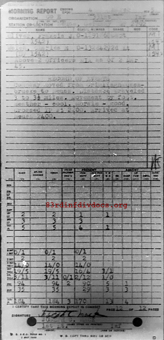 Company moved from Grimlinghausenbrucke to Neuss, Distance traveled 3 to 3 1/2 miles. Movement by foot. Weather - cool. Morale - good. Crossed IP at 2200, arrived at Neuss 2400.
