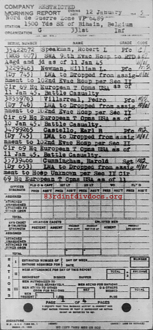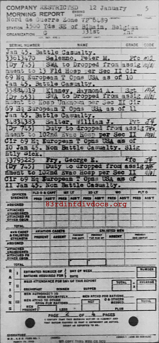 Company assisted in the new attack on objective in vicinity of La Vieille Taille, Belgiu. Followed Co 'E' in bypassing Co 'F' position and continued advance. Met stiff resistance and intense mortar and artillery fire from well emplaced and heavily fortified enemy positions. Weather Very Cold but clear. Morale Fair.