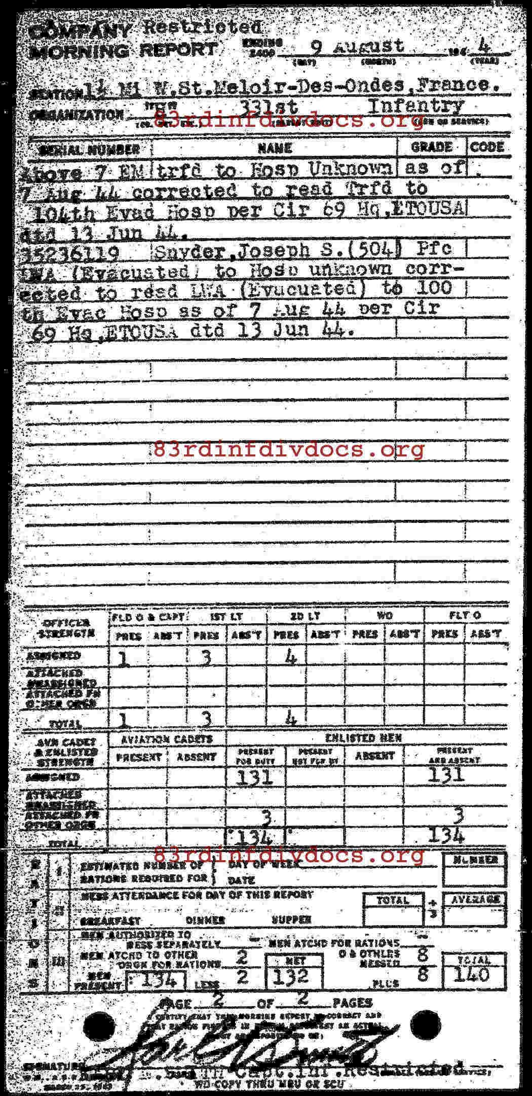 Morning report H/331 for August 9, 1944