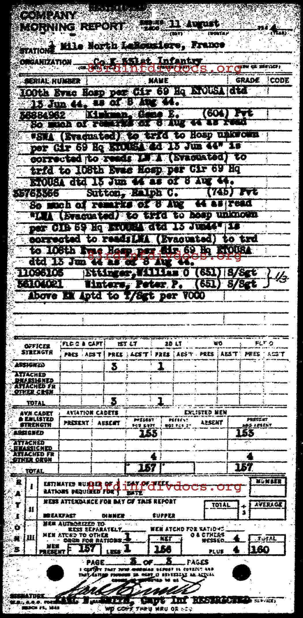 | 1944-08-11 | SSGT | Promoted to Technical Sergeant, duty changed to Platoon Sergeant (651) as of August 11, 1944 | K / 331 | view page | |