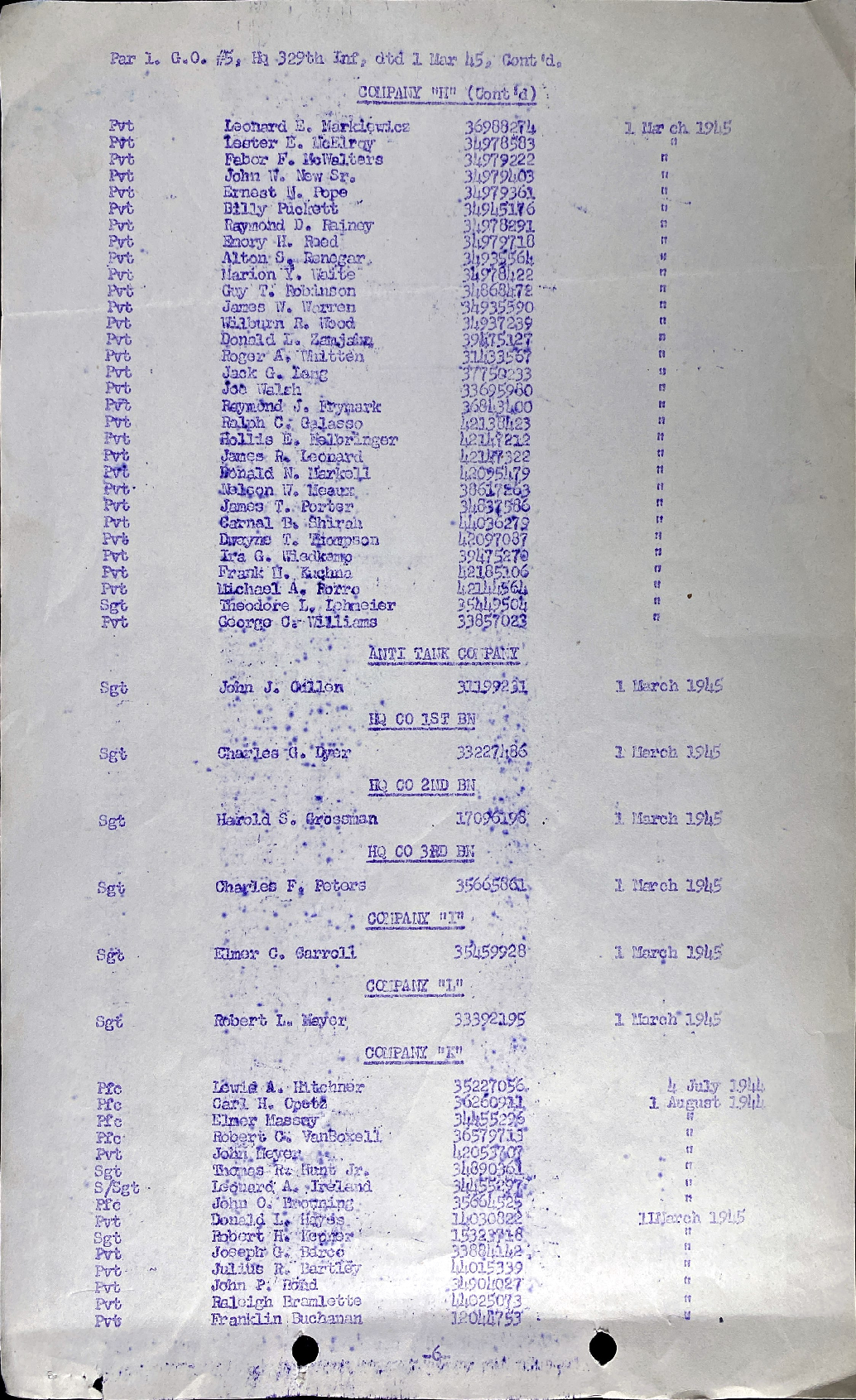 | 1945-02-10 | PVT | Promoted to Private First Class as of February 9, 1945 | K / 329 | view page | |