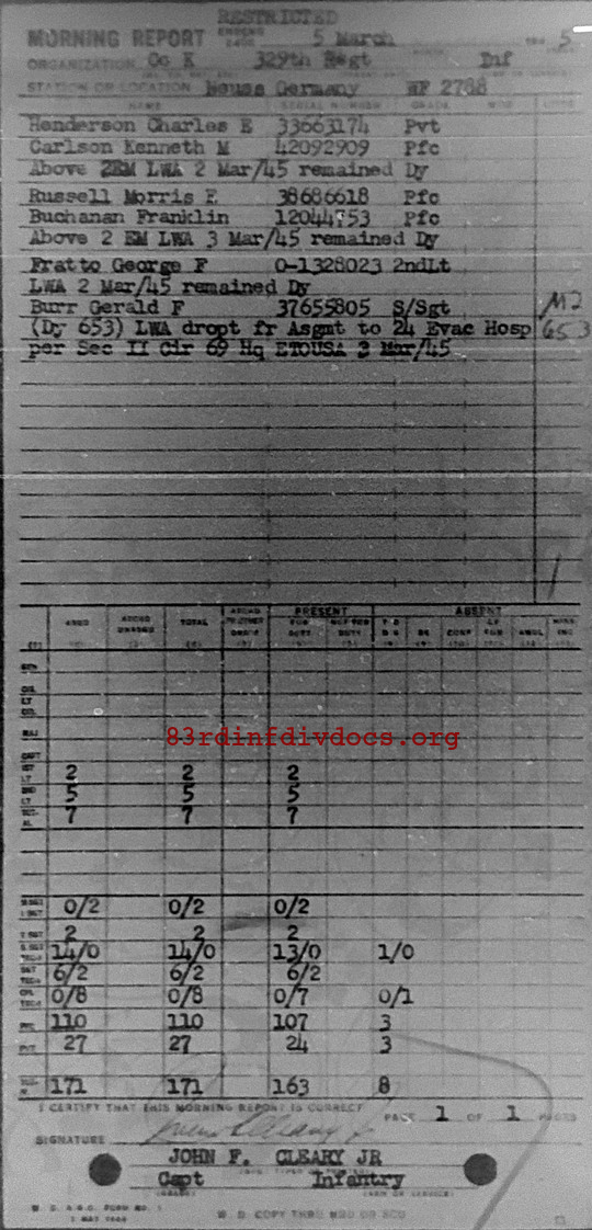 | 1945-04-12 | PFC | Killed in action on April 10, 1945 | 675 | K / 329 | view page |