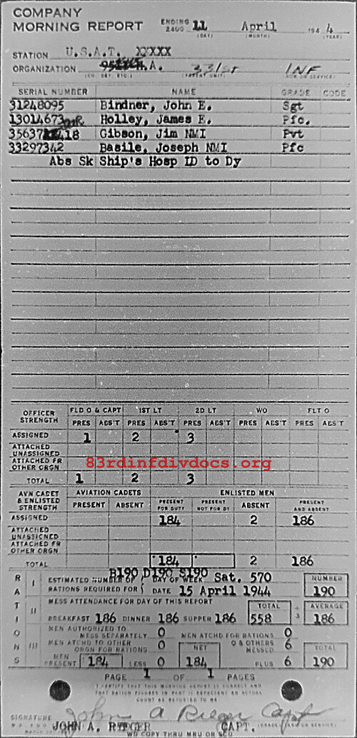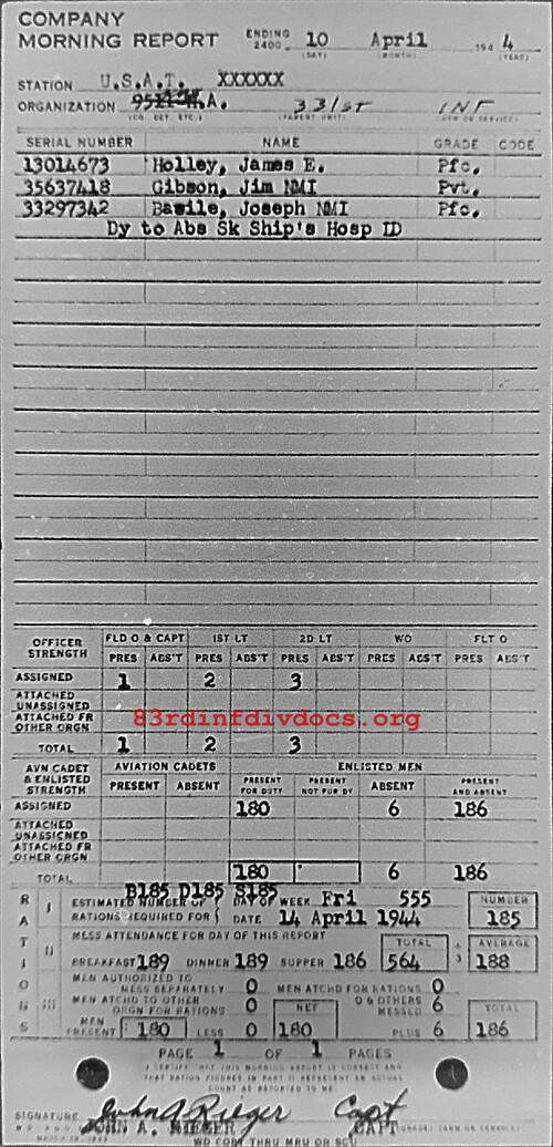 | 1944-04-10 | PFC | Non battle casualty and duty to Ship's Hospital on April 10, 1944 | A / 331 | view page | |
