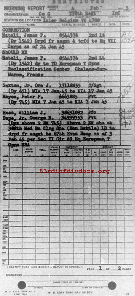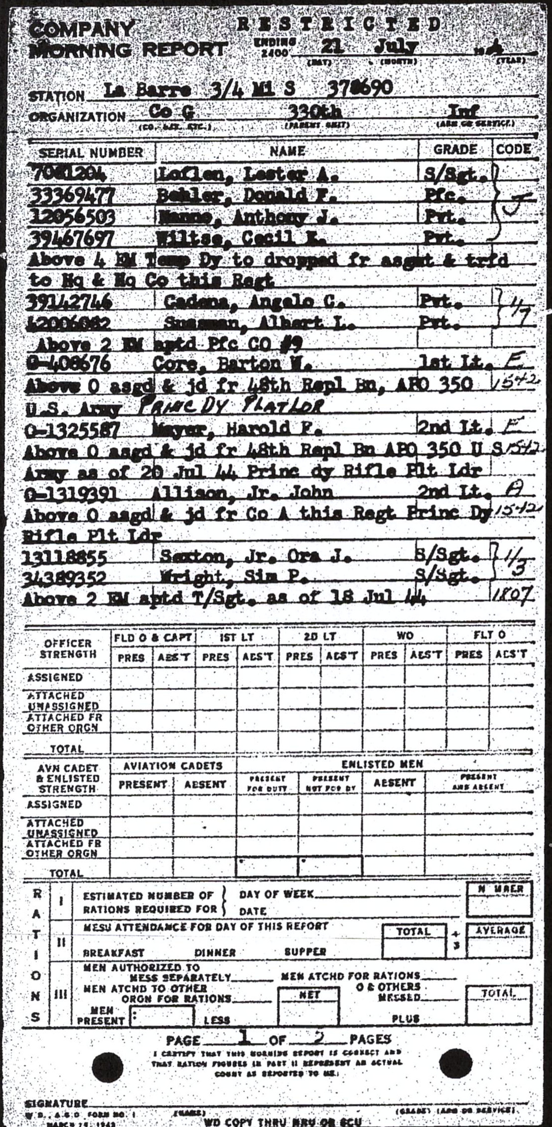 | Technical Sergeant Sexton was a member of G Company. The morning report for July 21, 1944 on page 39 lists his promotion to Technical Sergeant on July 18, 1944. The morning report for October 17, 1944 on page 17 lists him transferred to the 308th Medical Battalion Clearing Station due to a disease. Page 21, for October 21, 1944, lis ts him returning to duty. The pages can be seen below. |