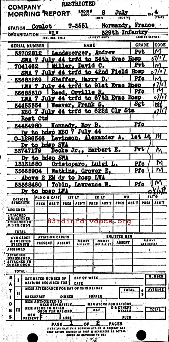 | 1944-07-09 | PFC | Lightly wounded in action and transferred to unknown hospital on July 9, 1944 | L / 329 | view page | |
