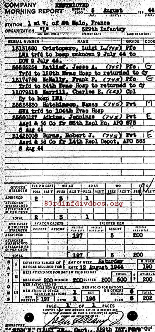 | Private First Class Cristoparo was a member of L Company. The morning report for July 8, 1944 on page 14 lists him as lightly wounded in action. Page 22, for July 9, 1944 lists him again lightly wounded in action. The morning report for August 5, 1944 on page 11 lists his status changed from lightly wounded in action to died of wounds on July 9, 1944. All relevant pages can be seen below. |
