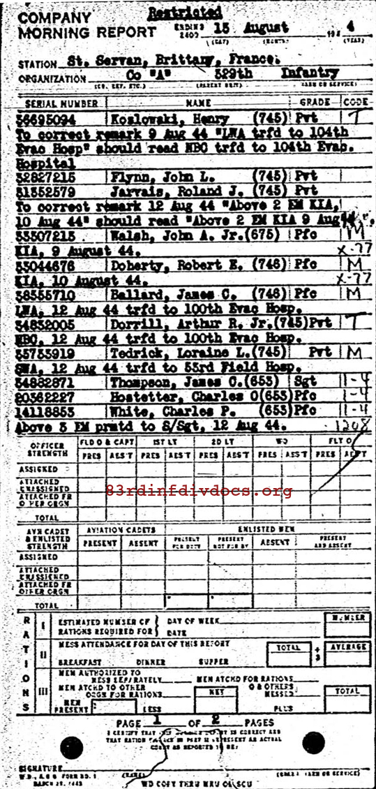 | Unit | A Company, 329th Infantry Regiment, 83rd Infantry Division |