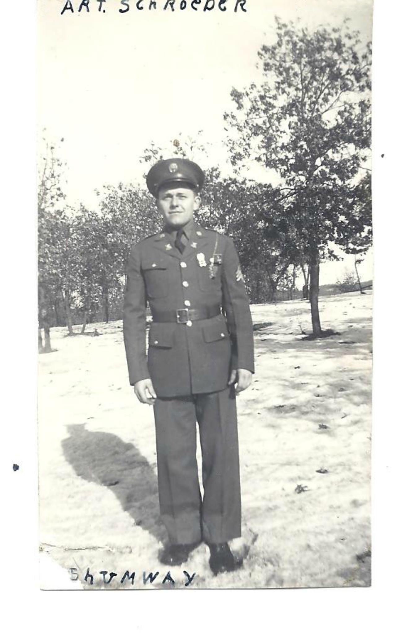 | Technical Sergeant Arthur H Schroeder was a member of A Company. The morning report for July 20, 1944 on page 30 and 31 lists his promotion to Staff Sergeant. The morning report for August 2, 1944 on page 5 lists his promotion to Technical Sergeant. Page 8, for August 8, 1944 of the same morning report lists him as Killed in Action. The relevant pages can be seen below. Jane Ries made a write-up on T/Sgt Schroeder based on some old newspaper articles: Technical Sergeant Arthur H. Schroeder, the youngest son of Chris Schroeder, was killed in action in France on August 8, 1944, according to word received from the War Department on August 30. Sgt. Schroeder was born July 3, 1918, the son of Chris and Minnie Schroeder at the family farm near Beecher City, Illinois. He attained the age of 26 years and one month at the time of his death. T/Sgt. Schroeder had received the Purple Heart having been wounded in action a month before his death. He entered the Army on October 1, 1940, serving 17 months in Iceland. He returned to the states in August 1943. Sometime in April of 1944, he was sent to England and in June he was sent to France, where he took part in the Invasion. He was with the 330th Infantry 83rd Division and rose to the rank of Technical Sergeant. He leaves to mourn his departure his father, one brother, two sisters, and a host of relatives and friends. He was preceded in death by his mother Minnie. A memorial stone for Arthur H. Schroeder is located at Trinity Lutheran Cemetery in Shumway, Illinois. He is buried in Brittany American Cemetery, St James, France. Rest in Peace, Arthur...... You are not forgotten. |
