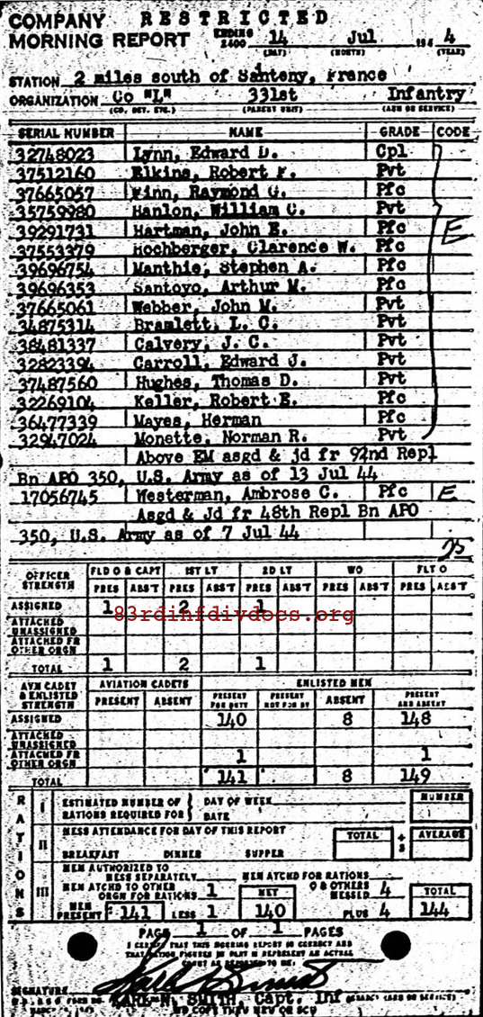| 1944-07-14 | PFC | Assigned and joined from 48th Replacement Battalion as of July 7, 1944 | L / 331 | view page | |