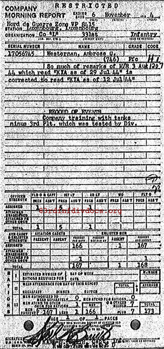 | The 331st Casualty Report (page 3, #110) for 1944 lists Pfc. Westerman as member of L Co. This differs from the previous registered company.