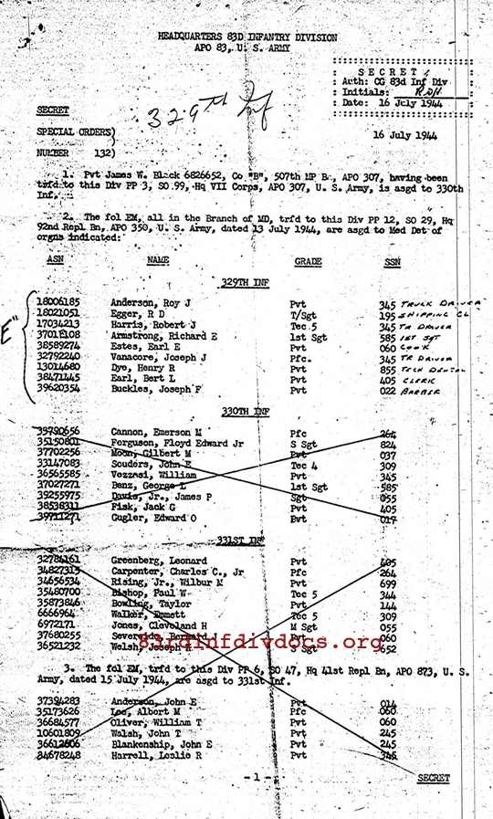 | 1944-07-17 | PVT | Assigned and joined from 92nd Replacement Battalion as of July 16, 1944 | 345 | MEDDET / 329 | view page |