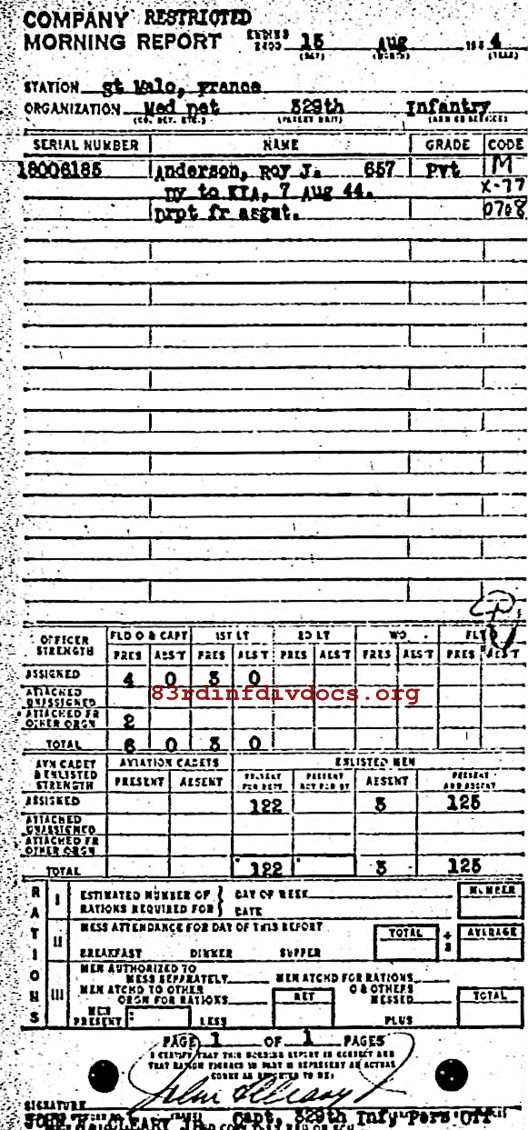 | Private Anderson was a member of the Medical Detachment. The morning report for August 15, 1944 on page 15 lists him as killed in action on August 7, 1944. The page can be seen below. |