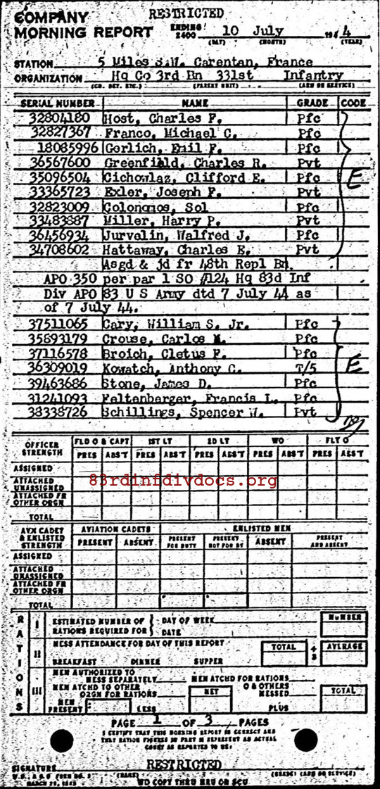 | 1944-07-10 | PFC | Assigned and joined from 48th Replacement Battalion as of July 7, 1944 | HQCO3BN / 331 | view page | |