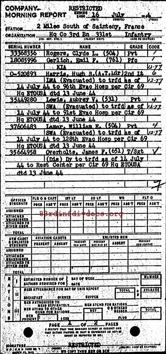 | Unit | 331st Infantry Regiment, 83rd Infantry Division |