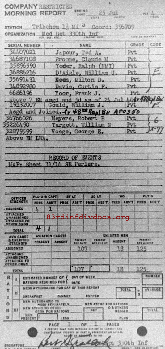 | 1944-07-25 | PVT | Assigned and joined from 48th Replacement Battalion as of July 25, 1944 | MEDDET / 330 | view page | |
