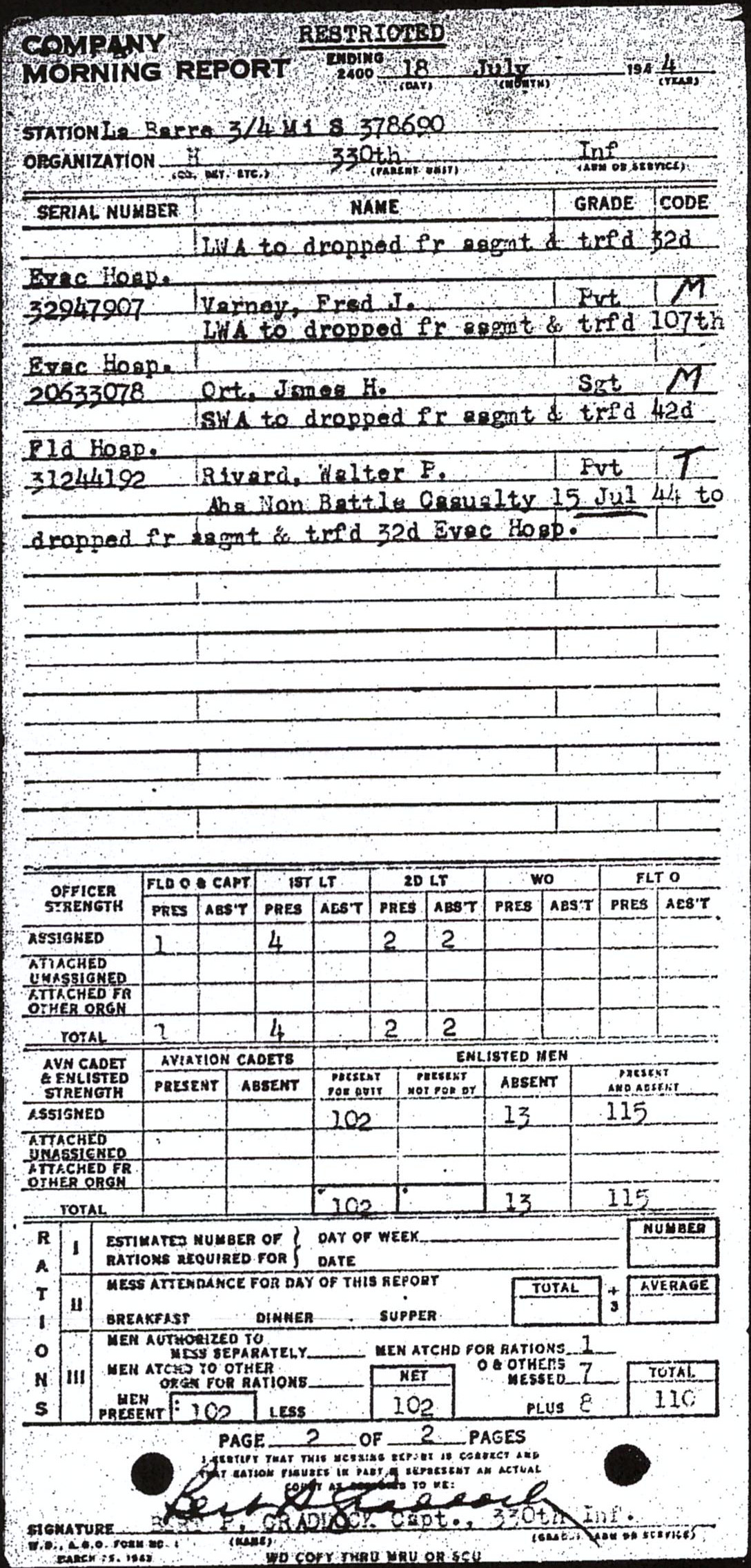 | 1944-07-18 | SGT | Severely wounded in action and transferred to 42nd Field Hospital on July 18, 1944 | H / 330 | view page | |