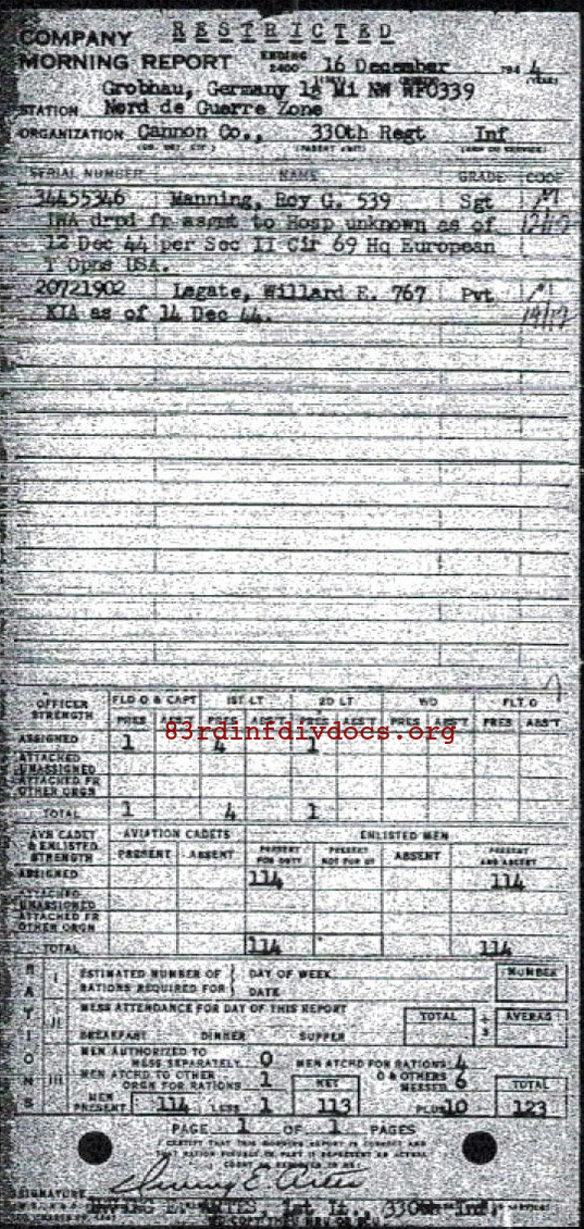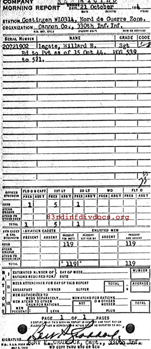 | Private Legate was a member of the Cannon Company. The morning report for October 21, 1944 on page 21 lists him reduced in rank from Sergeant to Private. The morning report for December 16, 1944 on page 16 lists him as killed in action. The pages can be seen below. |
