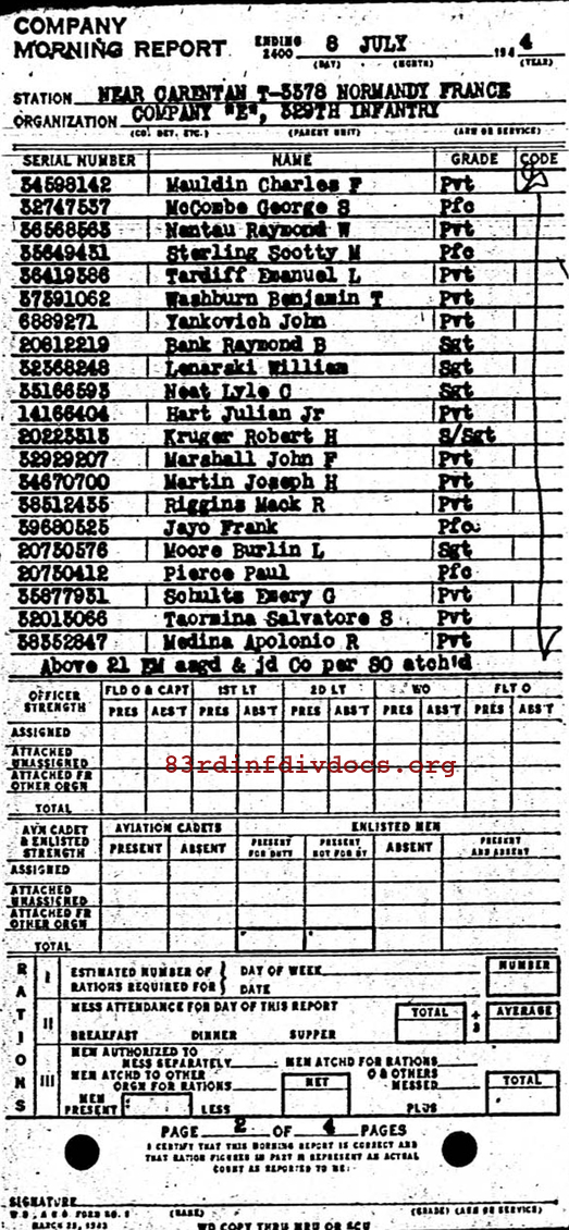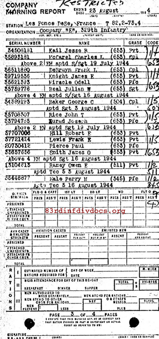 | Sergeant Pierce was a member of E Company. The morning report for July 8, 1944 on page 15 lists him joining E Company as a Private First Class. The morning report for August 23, 1944 on page 44 shows his promotion from Private First Class to Sergeant on August 16, 1944. All pages can be seen below. Since we have no later documents we assume that Sergeant Pierce died while serving in E Company. |