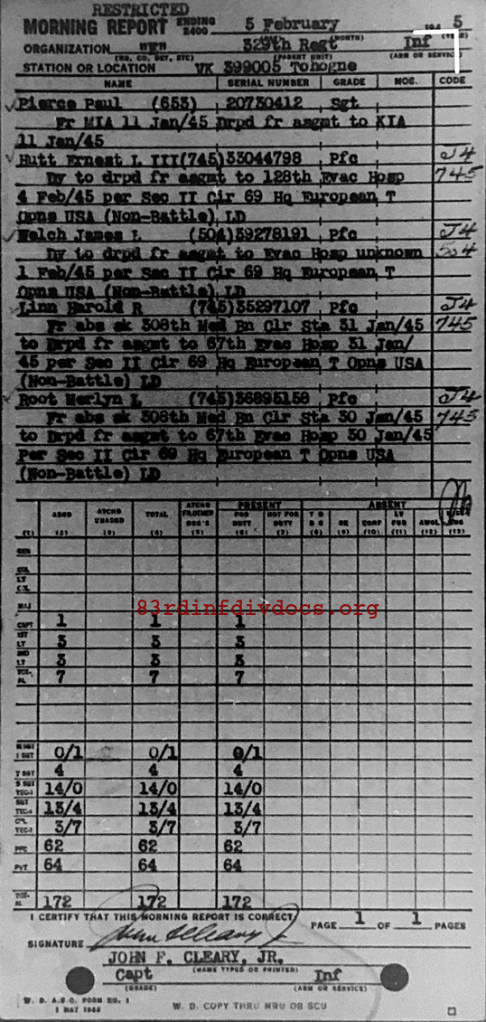 | 1945-02-05 | SGT | Killed in action on January 11, 1945 | 653 | E / 329 | view page |