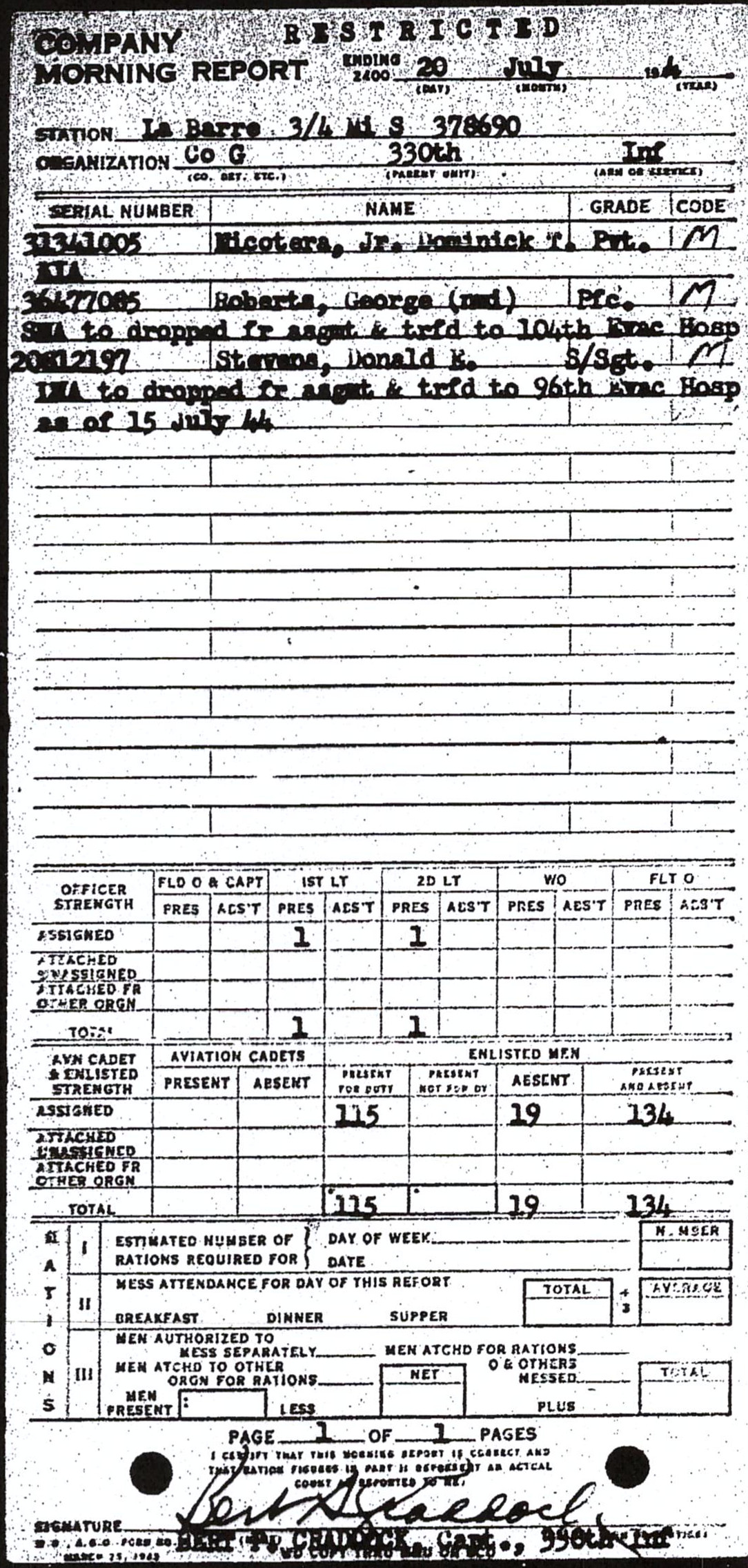 | 1944-07-20 | SSGT | Lightly wounded in action and transferred to 96th Evacuation Hospital on July 15, 1944 | G / 330 | view page | |
