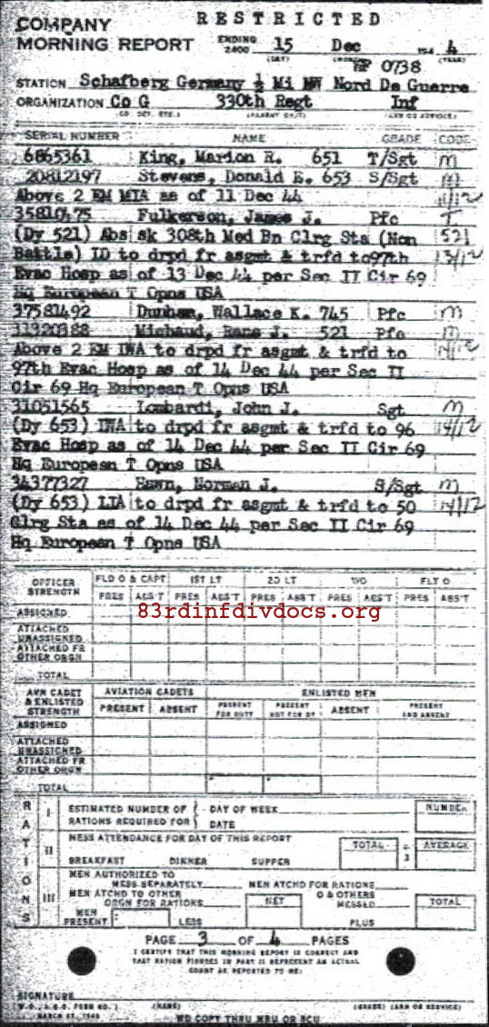 | Staff Sergeant Stevens was a member of G Company. The morning report for July 11, 1944 on pages 21 and 22 list him joining the unit from the 92nd Replacement Battalion on July 8, 1944. Page 38, for July 20, 1944, lists him lightly wounded in action and transferred to the 96th Evacuation Hospital on July 15, 1944. The morning report for December 15, 1944 on page 28 lists him as missing in action as of December 1 1, 1944. The pages can be seen below. |