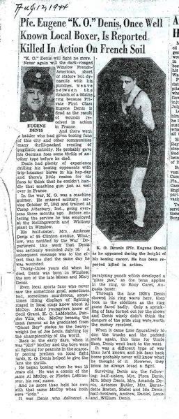| Private Dennis was a member of B Company. The morning report for July 16, 1944 on page 23 lists him as Severely Wounded in Action and transferred to the 42nd Field Hospital. Page 38, for July 24, 1944, lists his status changed to Died of Wouns. Patrick Leullier, the adopter of the grave of Private Dennis, kindly provided the newspaper articles and his IDPF. |