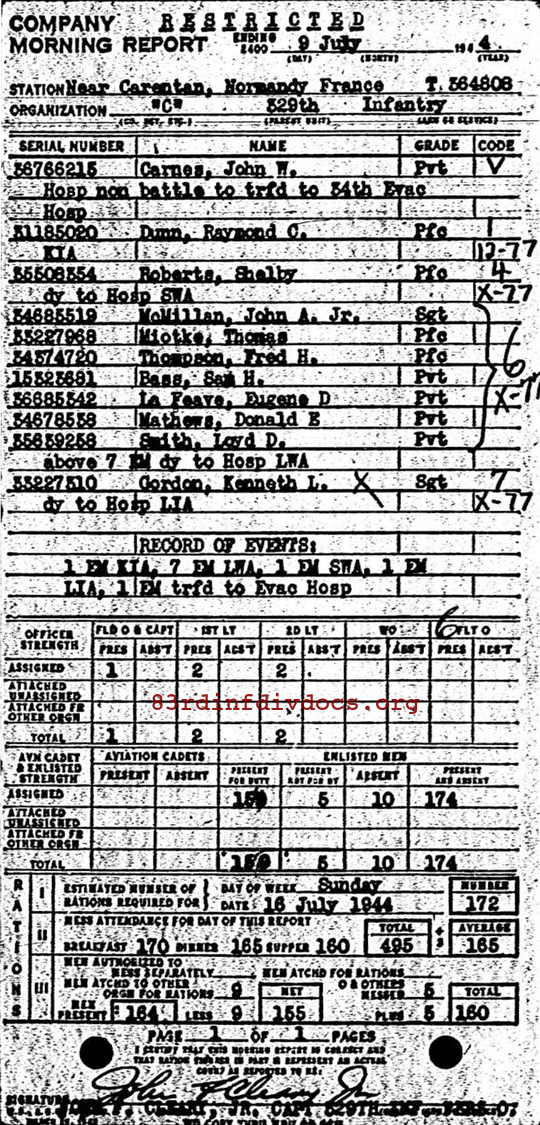 | Private First Class Dunn was a member of C Company. The morning report for July 9, 1944 on page 18 shows him killed in action. Page 18 can be seen here. |