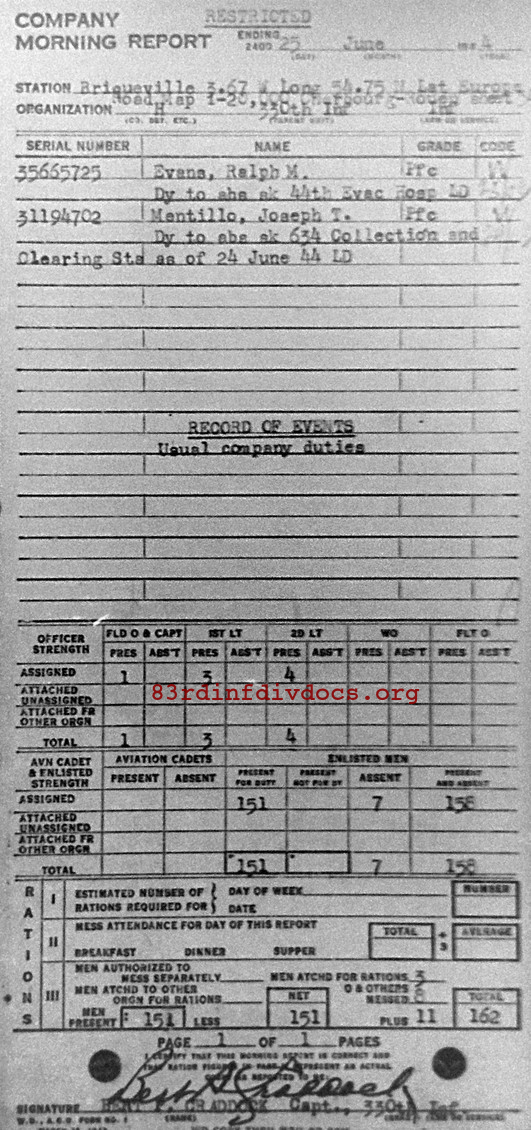 | 1944-06-30 | PFC | Returned to duty from 634th Clearing Station on June 28, 1944 | H / 330 | view page | |