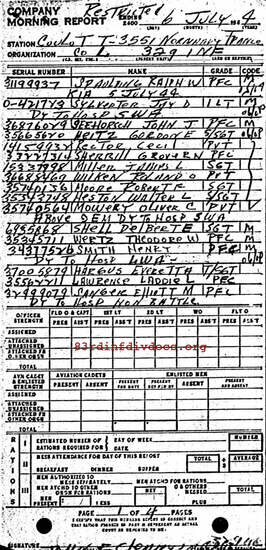 | Private First Class Spaulding was a member of L Company. The morning report for July 6, 1944 on page 8 lists him as killed in action. The page can be seen below. |