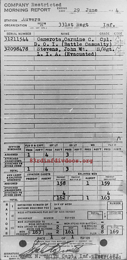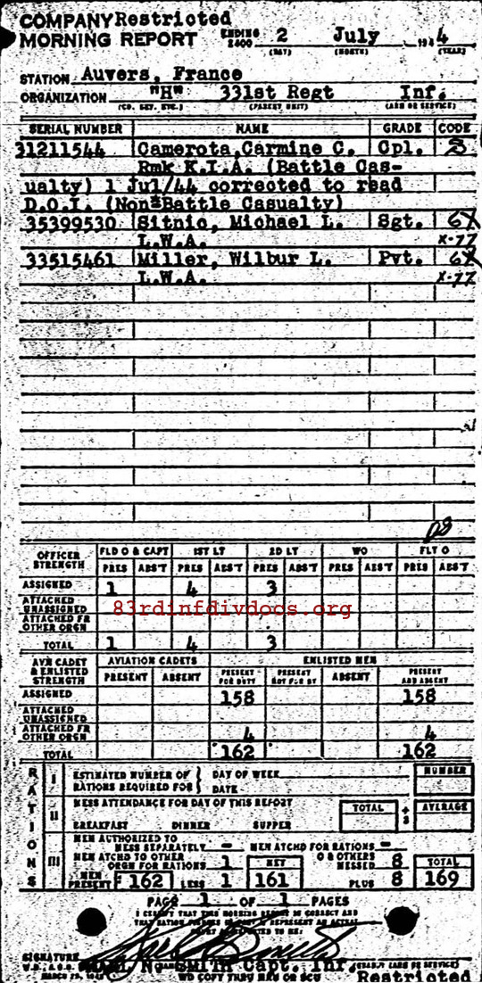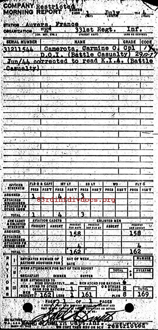 . The morning report for July 1, 1944 on page 1 lists a correction from died of injuries (DOI) to killed in action. The pages can be seen below. The 331st Casualty Report (page 3, #91) for 1944 also lists Corporal Camerota as member of H Co. |