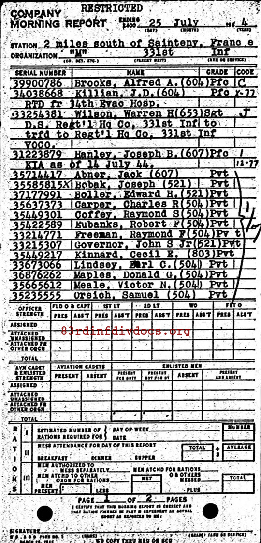 | Private Hanley was a member of M Company. The morning report for July 25, 1944 on page 44 lists him as KIA on July 14, 1944. The page can be seen below. |