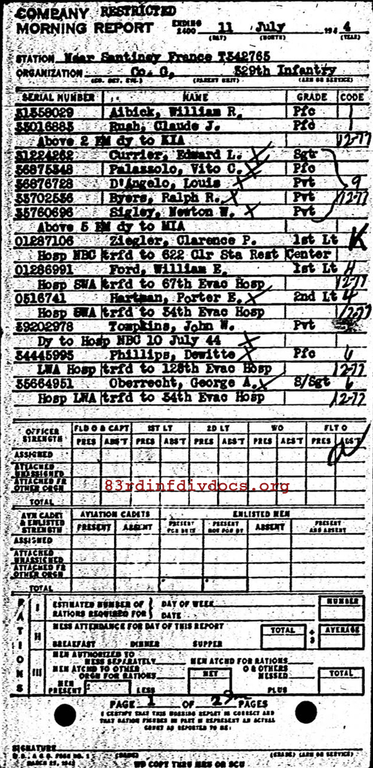 | Sergeant Currier was a member of G Company. The morning report for July 11, 1944 on page 21 lists him as missing in action. Page 48 changes his status from missing in action to killed in action on July 10, 1944. All relevant pages can be seen below. |