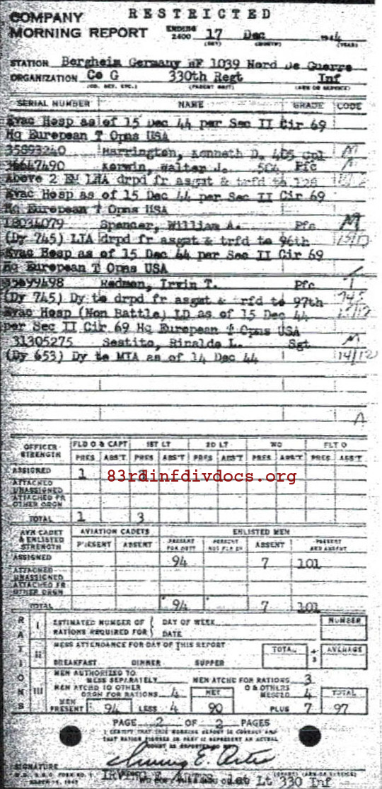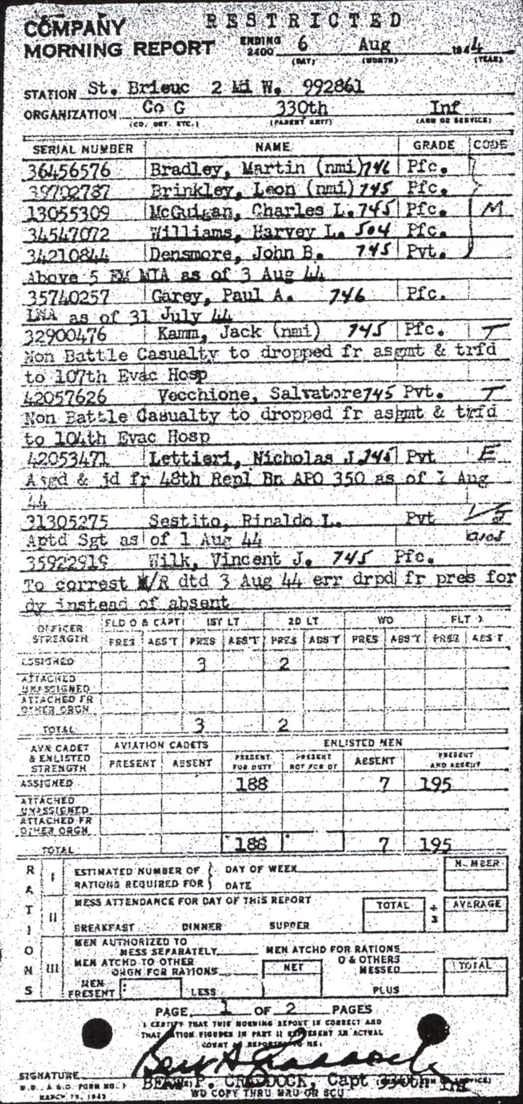| Sergeant Sestito was a member of G Company. The morning report for July 11, 1944 on pages 19, 20 and 21 list him joining the unit from the 48th Replacement Battalion on July 7, 1944. The morning report for August 6, 1944 on page 13 lists his promotion to Sergeant on August 1, 1944. The morning report for December 17, 1944 on page 32 lists him as missing in action as of December 14, 1944. The pages can be seen below. |