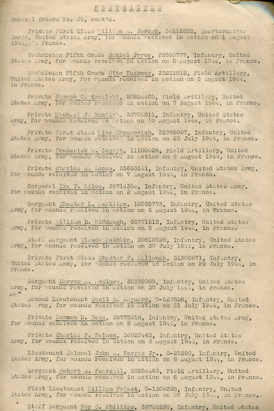 Purple Heart awarded for wounds received in action on July 29, 1944 in France. |