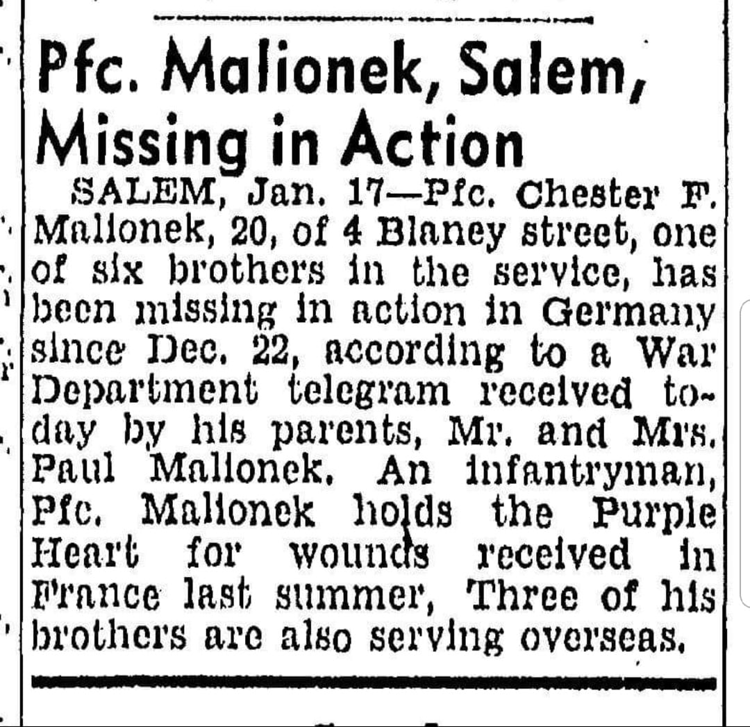 | Private First Class Malionek was a member of G Company. The morning report for July 11, 1944 on pages 20 and 21 list him joining the unit from the 48th Replacement Battalion on July 7, 1944. General Order 25 lists his commendation for a Purple Heart for wounds received in action on July 29, 1944, they are not listed in the July or August 1944 morning reports. The morning report for December 23, 1944 on page 39 lists him as missing in action on December 22, 1944. The pages can be seen below. |