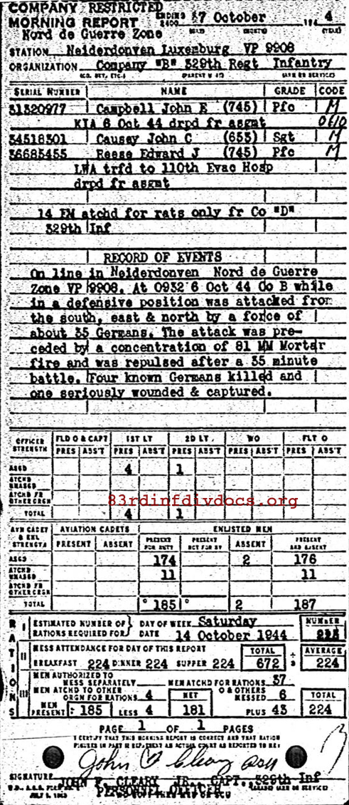 | Private First Class Campbell was a member of B Company. The morning report for October 7, 1944 on page 7 lists him killed in action on October 6, 1944. The page can be seen below. |