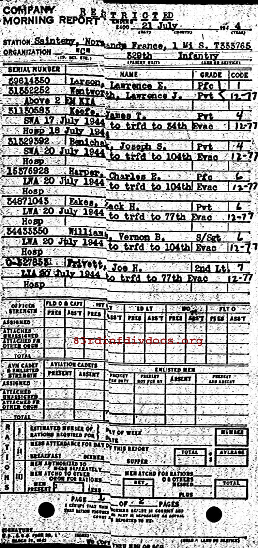 | 1944-07-21 | PVT | Killed in action on July 21, 1944 | C / 329 | view page | |