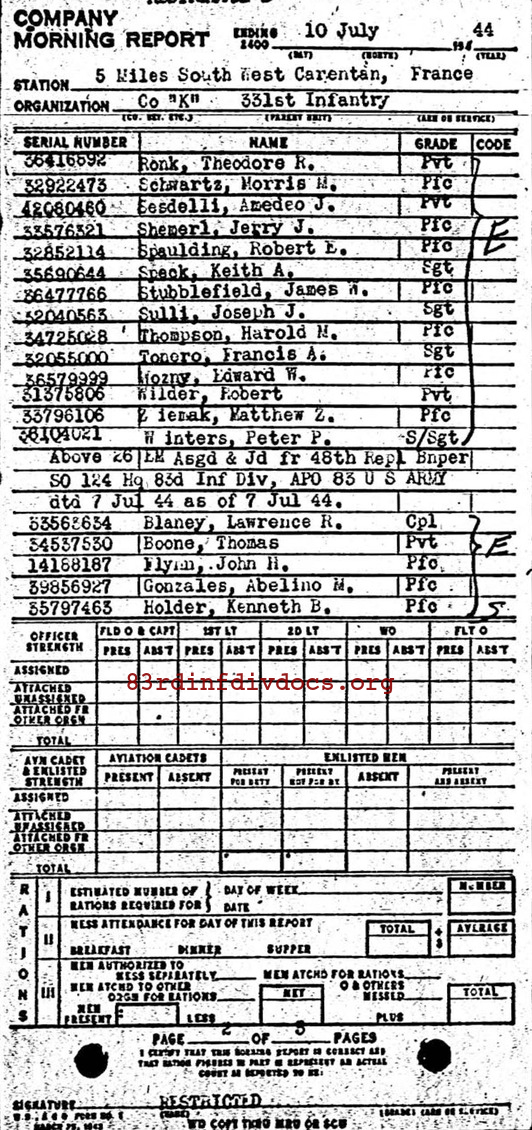 | 1944-07-10 | PVT | Assigned and joined from 48th Replacement Battalion as of July 8, 1944 | K / 331 | view page | |