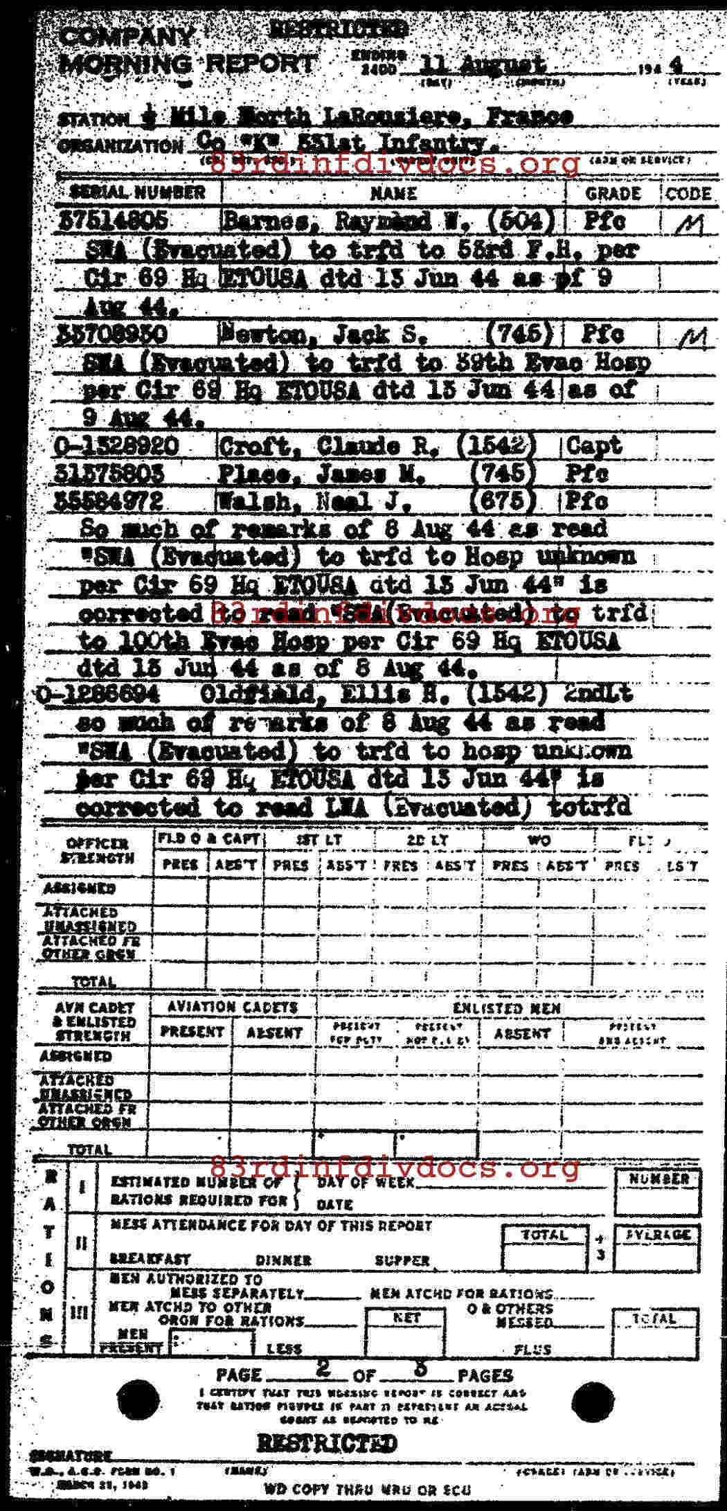 | 1944-08-11 | PFC | Severely wounded in action and transferred to 100th Evacuation Hospital on August 8, 1944, which corrects MR of August 8, 1944 | 745 | K / 331 | view page |