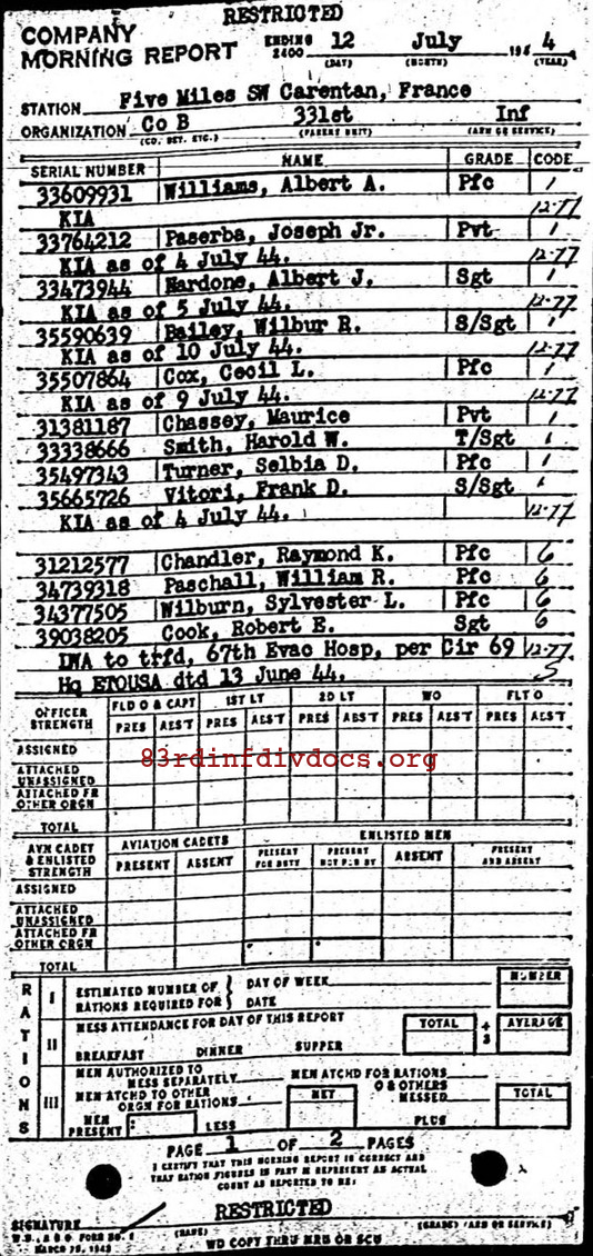 | 1944-07-12 | PVT | Killed in action on July 4, 1944 | B / 331 | view page | |